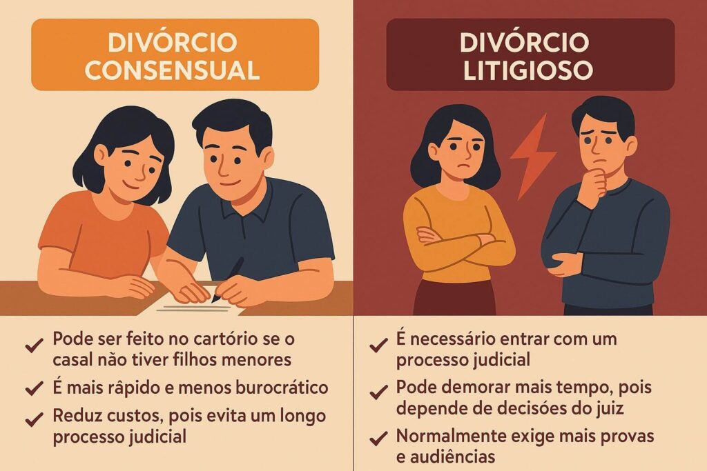 O divórcio é um momento delicado, e a forma como ele será conduzido pode impactar todo o processo. No Brasil, há dois tipos principais de divórcio: consensual e litigioso. O divórcio consensual ocorre quando ambas as partes concordam em se separar e entram em acordo sobre bens, guarda dos filhos e pensão. ✔ Pode ser feito no cartório se o casal não tiver filhos menores✔ É mais rápido e menos burocrático✔ Reduz custos, pois evita um longo processo judicial O divórcio litigioso acontece quando há discordância entre o casal sobre um ou mais pontos da separação, como divisão de bens, guarda ou pensão. ✔ É necessário entrar com um processo judicial✔ Pode demorar mais tempo, pois depende de decisões do juiz✔ Normalmente exige mais provas e audiências O ideal é sempre buscar um acordo para que o processo seja mais rápido e menos desgastante. No entanto, quando não há possibilidade de consenso, o divórcio litigioso se torna necessário. Caso esteja passando por esse momento e precise de orientação, entre em contato para entender qual a melhor opção para o seu caso!